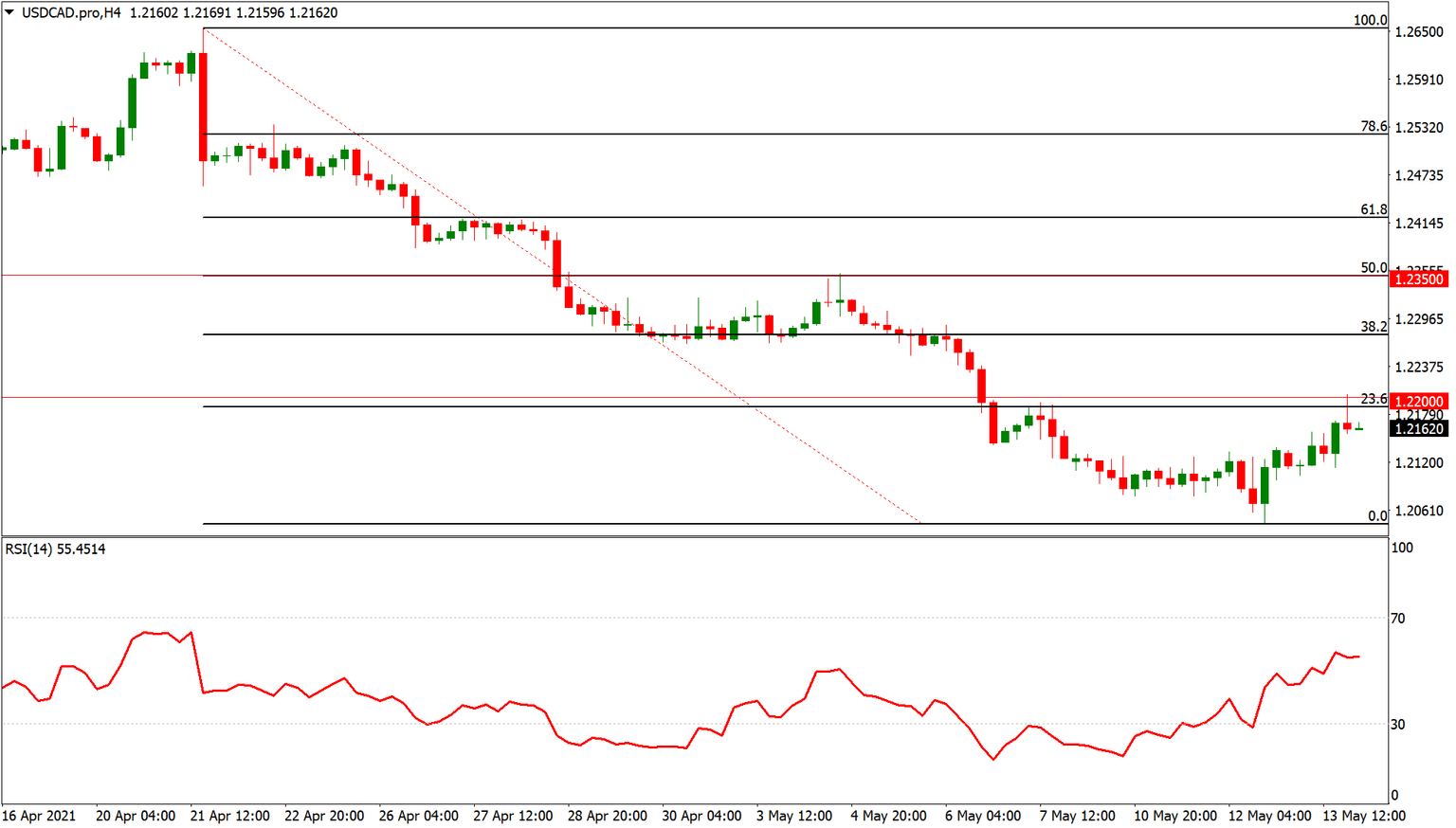 We recently noted the risk of a short squeeze in USD/CAD amid heavily oversold conditions and with the Dollar having caught a bid and Oil prices slightly under pressure, this seems increasingly likely in the near-term. The currency pair is facing immediate resistance at 1.22. A clear breakout above this level should help it gain momentum and push price towards the key 1.2350 resistance level (which is also the 50% Fibonacci level of the April decline), where sellers are likely to return in greater numbers.