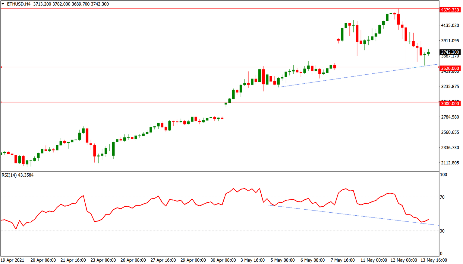 From a technical perspective, the short-term outlook for ETH/USD remains positive. The cryptocurrency bounced once again off the $3520 support level, and the H4 chart is showing positive RSI divergence. With the pressure mostly on Bitcoin, Ethereum should be able to recover from the recent sell-off fairly quickly. Bulls are eyeing the record high at $4379 as next target. On the other hand, a breakout below $3520 could lead to further momentum selling, but ETH/USD should find strong support ahead of the psychological support level at $3000.