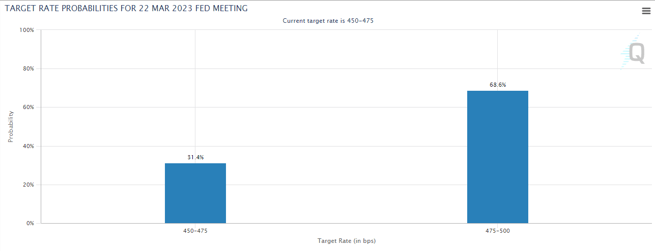 At the time of press, the CME Group FedWatch Tool shows that markets are pricing in a nearly 70% probability that the Fed will hike its policy rate by 25 bps. It’s worth noting, however, that that probability dropped below 50% several times since the beginning of the turmoil.