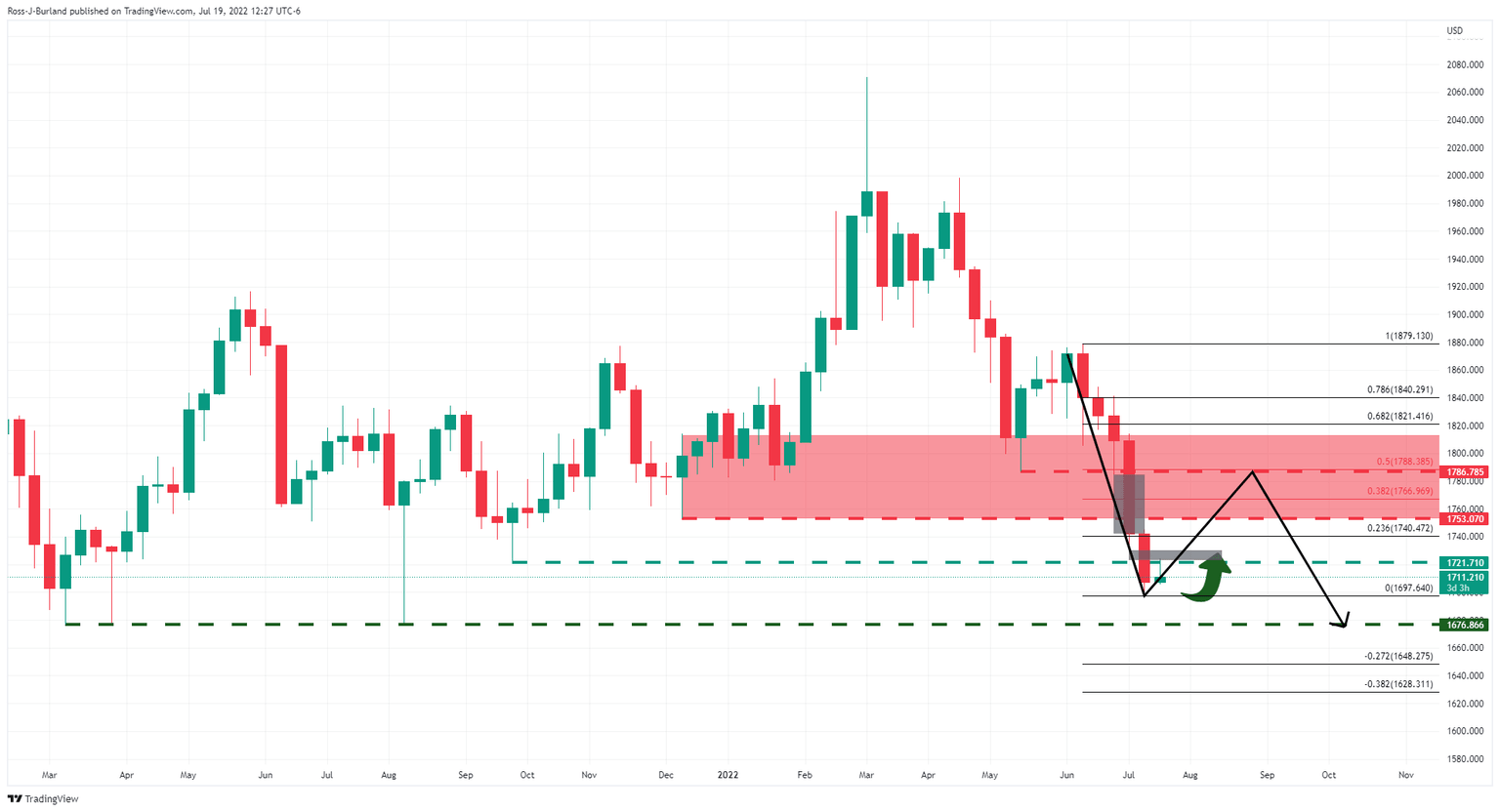 Gold price is flat in Asia in a quiet session consolidating the overnight volatility. With that being said, equities are following the lead that was made on Wall Street with the Nikkei up a stunning 2% in the first hour of trade. As such, the US dollar is on the backfoot as risk-on sentiment persists. Overall, XAUUSD leans bullish with time frame continuity within the bullish correction of the recent leg of supply from $1,750 that took out the $1,700 level last week. The pullback in the US dollar continues to support the gold price as investors move to the sidelines ahead of key central bank meetings.