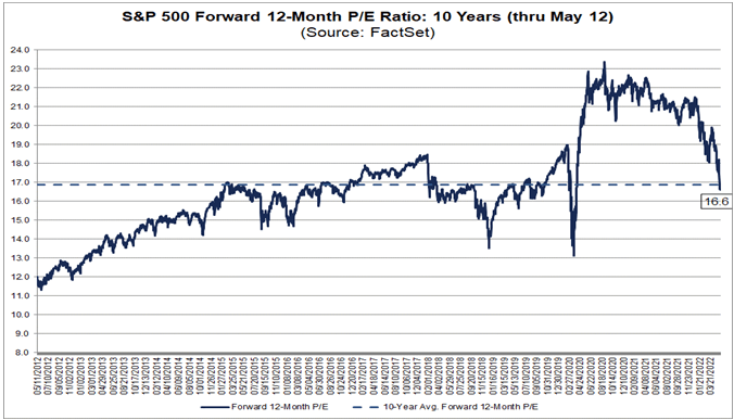 The forward P/E ratio for the S&P 500 does tend to vary and in times of recession can move to nearer to 10. Over the past 10 years, we are at the historical average but recent events such as the 2018 taper tantrum saw it move to nearer 12. Earnings per share (EPS) tend to move lower by approximately 5 to 10% in times of recession. If we assume the 2023 EPS forecast of $251.52 (chart above) moves down 10% that gives us $225. Then applying a multiple of 12 gives what we feel is a worst-case price target for the S&P 500 (SPX) of 2,700. Look out below. However, if we maintain the current average forward P/E around current levels, which is after all the ten-year average, then things look a bit better. Using 15 for ease implies a price target of 3,375 for the S&P 500. About 10% lower than where we currently are.