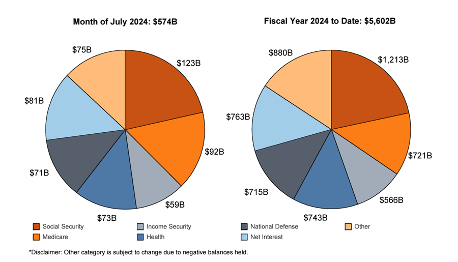 Last month, the U.S. government spent $88.5 billion just paying interest on the national debt. This number is lower than the average in recent months because some of July's interest was paid in June due to calendar effects. Even so, interest expense was more than national defense ($71 billion) and nearly as much as Medicare ($92 billion).