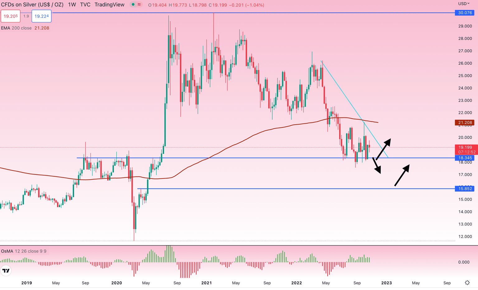 However, another leg up is likely if the trend line is broken. So unless the trend line is broken, it is similar to gold. There is still space to fall lower by 15% in total. The downward move to the COVID-19 low from early 2020 is unlikely.