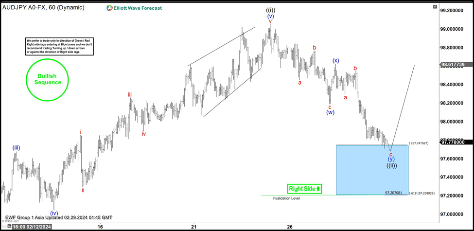 Down from there, the pair is doing a short-term pullback in wave ((ii)) to correct the cycle from the 2/01/2024 low. The pullback from the peak is unfolding as Elliott wave double three correction where wave (w) ended at 98.18 low in 3 swings. While a bounce to wave (x) ended at 98.62 high and started the (y) leg lower. Towards 97.47- 97.20 100%- 161.8% Fibonacci extension area of (w)-(x) blue box area. Near-term, as long as it remains above the 97.20 low the pair is expected to find buyers from the blue box area for the next leg higher or should produce a 3 wave reaction higher at least.