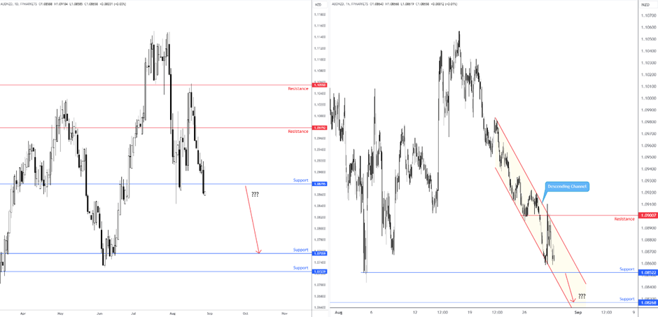 Short-term flows on the H1 timeframe show declines have been confined between the limits of a descending channel, extended from the high of NZ$1.0981 and a low of NZ$1.0897. Following the release of Aussie CPI inflation numbers, you will see that, in one fell swoop, the cross briefly rallied from channel support to channel resistance, which happened to share chart space with another resistance coming in at NZ$1.0900 and held its position.