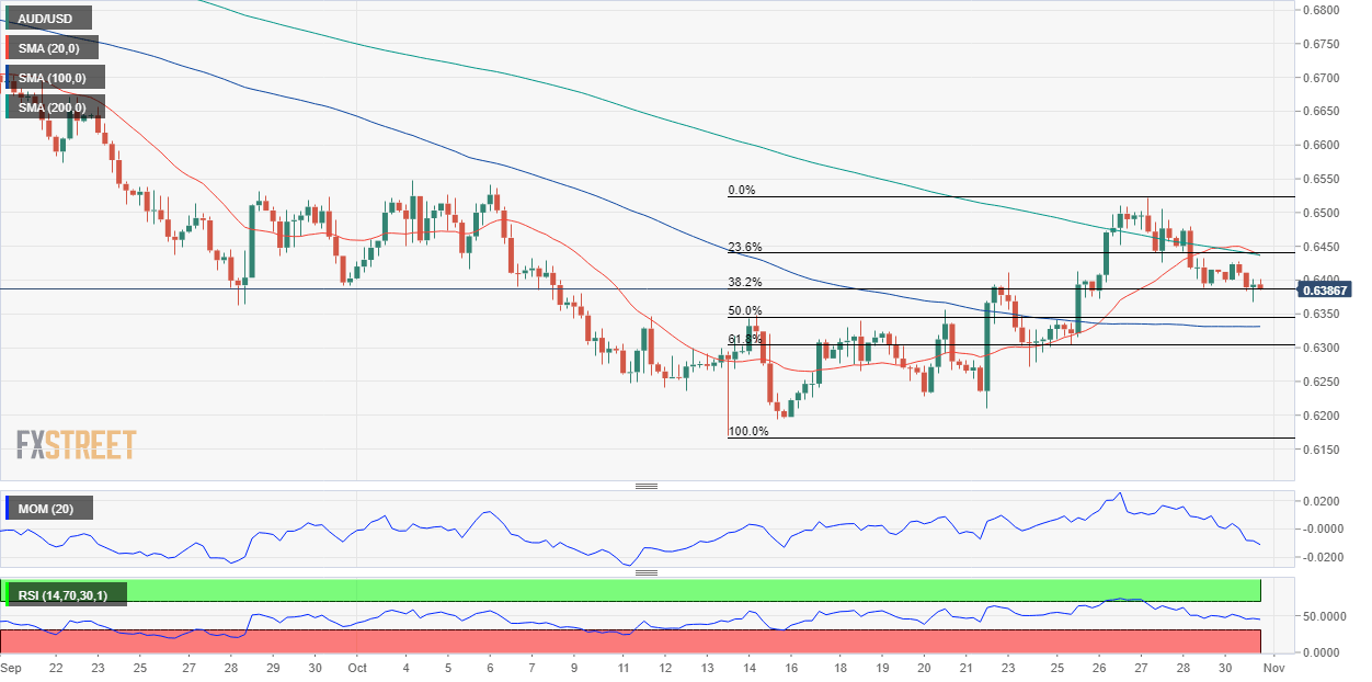 The AUD/USD pair is hovering around the 38.2% retracement of its latest daily run measured between 0.6169, the year low, and 0.6521, at 0.6385. The daily chart shows that the pair is also above a mildly bearish 20 SMA, which stands a few pips below the daily low. The longer moving averages keep heading south far above the current level, maintaining the long-term bearish trend in place. In the meantime, the Momentum indicator remains flat above its 100 level, but the RSI indicator already turned south, now standing at around 47.