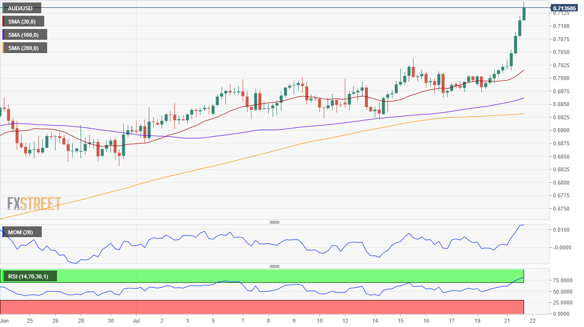 The AUD/USD pair is trading near the mentioned high, poised to extend its advance despite being overbought in the short-term. The 4-hour chart shows that technical indicators head firmly north in extreme levels, as the pair develops far above all of its moving averages. The pair could now extend its rally towards the 0.7200 figure before meeting selling interest.