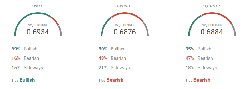 The FXStreet Forecast Poll shows that bulls dominate the weekly perspective, as the dollar is expected to maintain its negative stance across the board. Bulls stand at 69%, with the pair is seen on average at 0.6934, a strong static resistance area. Bears are a majority in the monthly and quarterly perspectives, but it both cases, falling short of 50% with the pair seen around the current level.