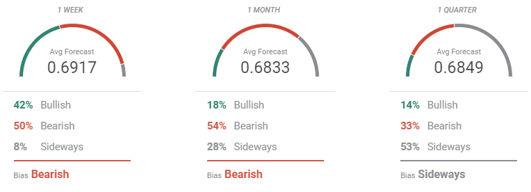 The FXStreet Forecast Poll shows that at least 50% of the polled experts are seeing the pair bearish in the upcoming weeks although the pair is seen on average, holding above a relevant support level at 0.6770. In the quarterly perspective, however, 53% vote are seeing AUD/USD hovering around the current levels.