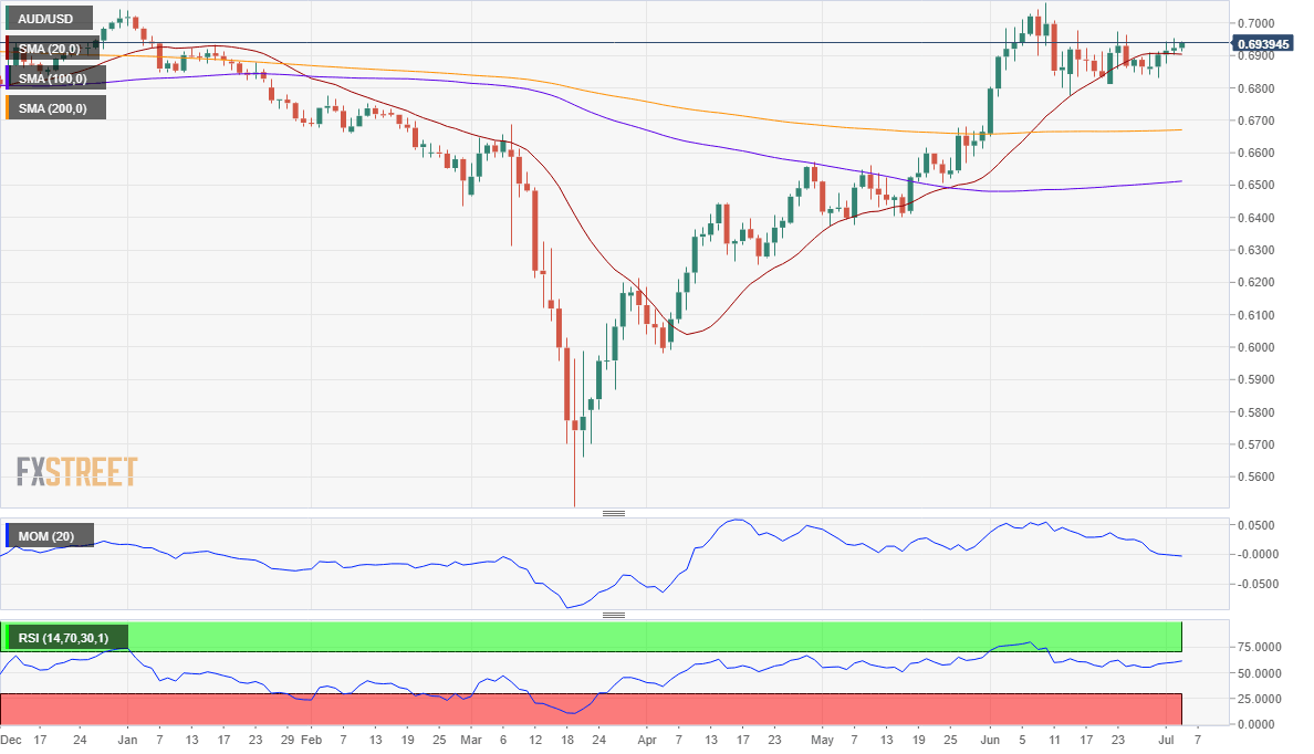 For a third consecutive week, the AUD/USD pair remained confined to familiar levels, not far from the year high posted in June at 0.7063. The weekly chart shows that the pair continues to seesaw around a marginally bearish 100 SMA, while the 20 SMA keeps advancing slowly below the current level. The Momentum indicator corrects overbought readings while the RSI consolidates around 60, all of which indicate that the bears are nowhere to be found.