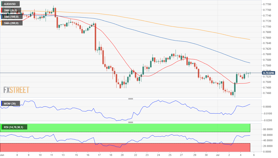 The AUD/USD pair is holding on to modest daily gains, offering a neutral-to-bullish stance in the near-term. The 4-hour chart shows that the price stands above its 20 SMA, which slowly turns higher, although the longer ones maintain their bearish slopes above the current level. The 100 SMA acts as dynamic resistance at around 0.7570. The Momentum indicator eases within positive levels while the RSI indicator consolidates around 56, reflecting the absence of volume instead of suggesting bullish exhaustion.