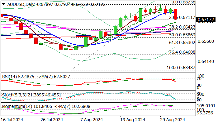 Break below 10DMA (0.6765) and subsequent acceleration, is pressuring initial Fibo support at 0.6711 (23.6% of 0.6348/0.6823), loss of which to reinforce negative signal, with near-term bias to remain with bears while the price stays below broken 10DMA.