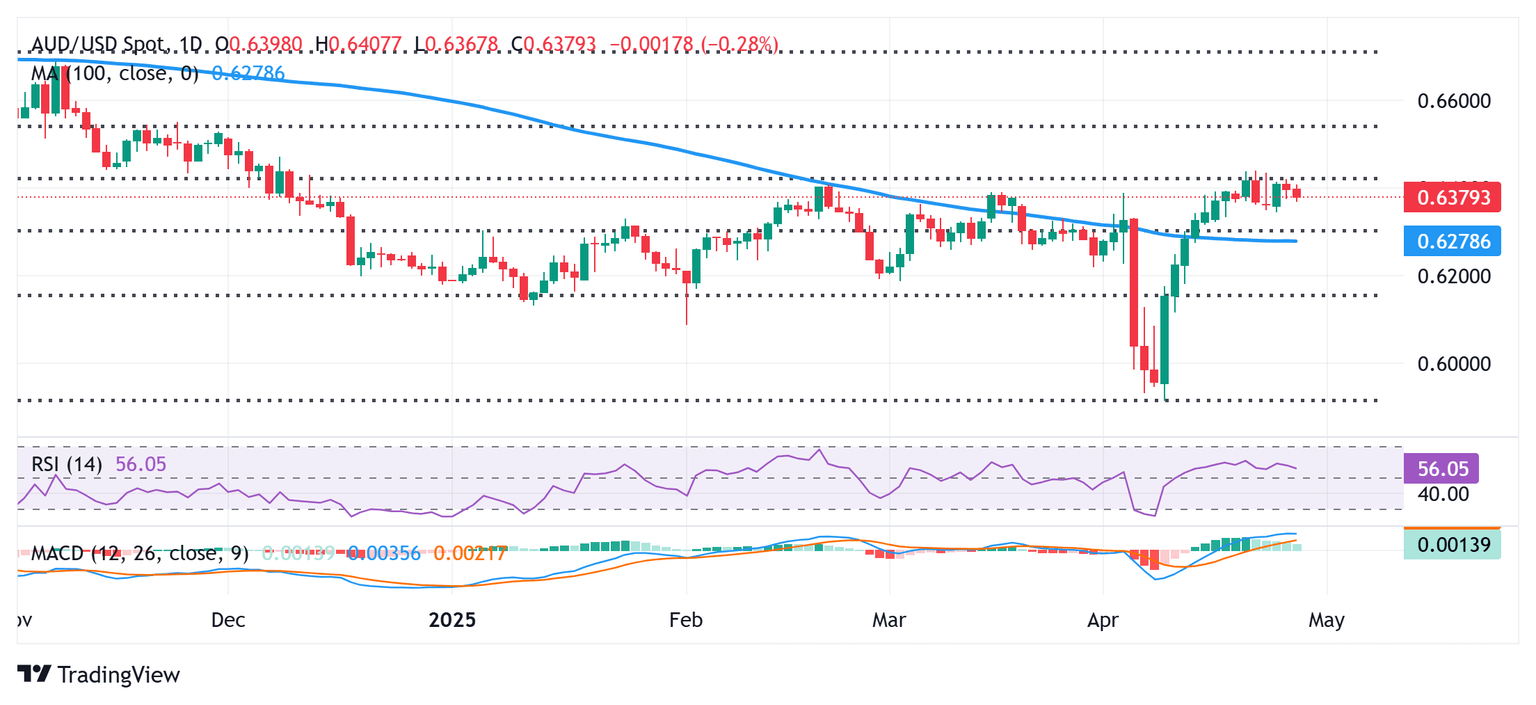 The range-bound price action witnessed over the past week or so might be categorized as a bullish consolidation phase against the backdrop of the AUD/USD pair's sharp recovery from the 0.5900 neighborhood, or a five-year low touched earlier this week. Moreover, the recent breakout above the 100-day Simple Moving Average (SMA) – for the first time since October 2024 – and positive oscillators on the daily chart suggest that the path of least resistance for spot prices is to the upside. That said, repeated failures to near the 50% Fibonacci retracement level of the September 2024-April 2025 downfall warrant some caution for bulls. The said barrier is pegged near the 0.6435-0.6440 region and should act as a key pivotal point for short-term traders.