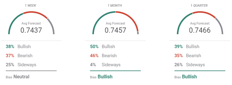 According to the FXStreet Forecast Poll, the AUD/USD pair could extend its gains in the upcoming months. The sentiment is neutral in the near term as bulls and bears are pretty much the same, with an average target of 0.7435. In the monthly view, bulls take the lead, which they maintain on the quarterly perspective. However, those betting for a decline to sub-0.7300 are quite enough to put at doubt the expected rally.