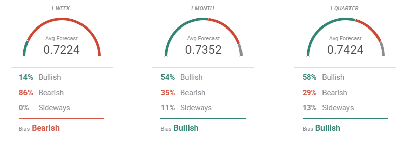 According to the FXStreet Forecast Poll the AUD/USD pair will remain under selling pressure next week, as 86% of the polled experts are betting for lower targets. On average, the pair is foreseen at 0.7224. Bull take over in the monthly and quarterly views, with the pair seen recovering above 0.7300 and 0.7400 respectively.