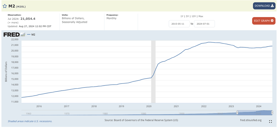 Looking at the M2 money supply, it is already going up, even before the Federal Reserve cuts rates. After bottoming in November 2023 due to the Fed’s relatively aggressive tightening cycle, the money supply began creeping up again early this year.
