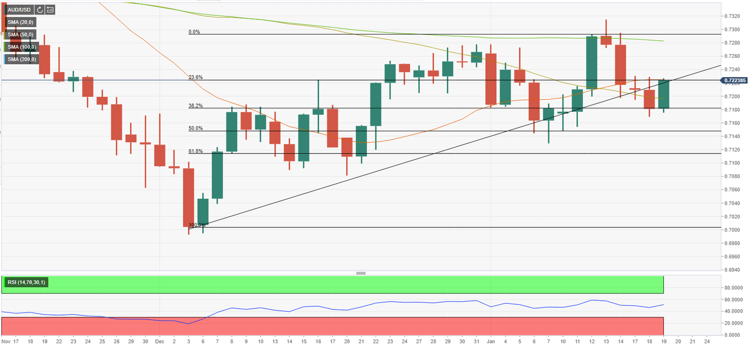 A daily close above 0.7230 (Fibonacci 23.6% retracement, ascending trend line) could be taken as a sign that the latest decline was the technical correction of the uptrend. Above that level, the 100-day SMA forms the next resistance at 0.7280 ahead of 0.7300 (psychological level).
