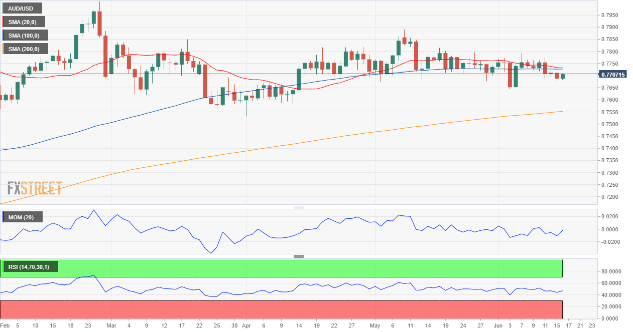 The AUD/USD pair has been directionless for over a month, now trading at the lower end of its range, struggling to retain the 0.7700 threshold. The risk is skewed to the downside, according to the daily chart, as the pair is developing below its 20 and 100 DMAs, both converging directionless in the 0.7740 price zone. Technical indicators lack directional strength but remain within negative levels.