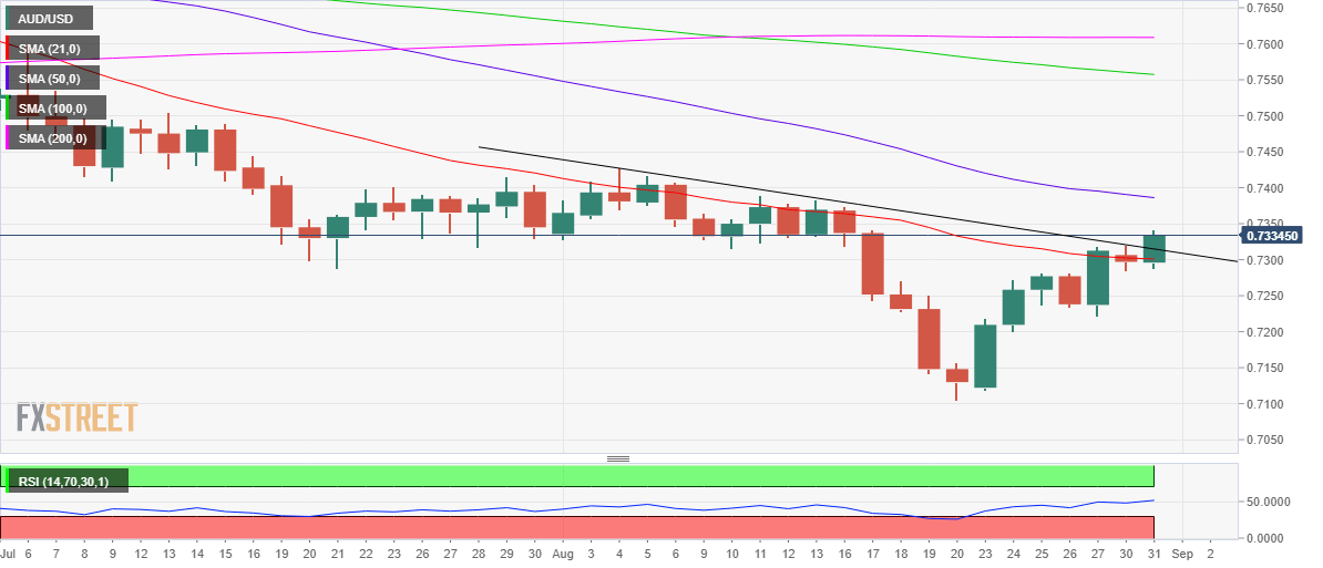 From a technical perspective, the daily chart shows that AUD/USD has taken out the three-week-old falling trendline resistance at 0.7314 on Tuesday. The aussie now awaits a daily close above the latter for bullish confirmation.