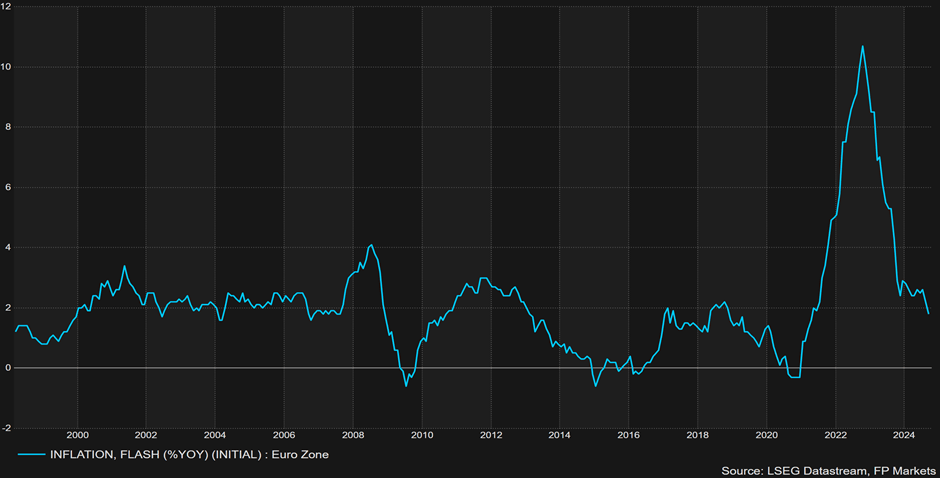 CPI Inflation (Consumer Price Index) in the eurozone slowed to 1.7% in September (YoY), down from 2.2% in August (market consensus: 1.8%) and stepping below the ECB’s 2.0% inflation target for the first time in over three years. However, the ECB expects inflation to rise before returning to the inflation target next year. The ECB stated: ‘Domestic inflation remains high, as wages are still rising at an elevated pace. At the same time, labour cost pressures are set to continue easing gradually, with profits partially buffering their impact on inflation’. In terms of core inflation, which strips out energy, food, alcohol and tobacco prices, came in slightly lower than forecast (2.8%) at 2.7% in September (YoY), down from 2.8% in August.