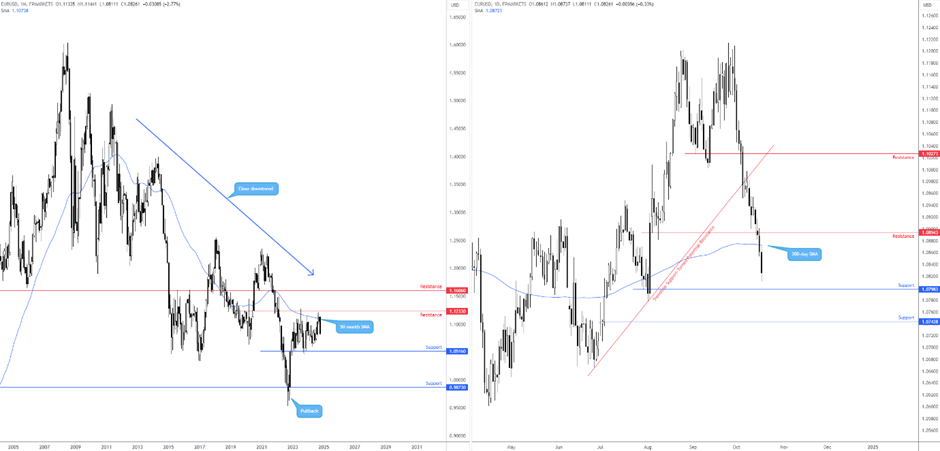 From a technical standpoint, a EUR/USD selloff was a strong possibility, given where the pairing was trading on the bigger picture. The 50-month simple moving average (SMA) welcomed price action in recent months (currently trading at US$1.1074), a dynamic value bolstered by key monthly resistance from US$1.1233. You will see that price sold off from the noted levels this month and is down nearly 3.0% and fast approaching April 2024 lows of US$1.0612, closely shadowed by neighbouring support at US$1.0516.