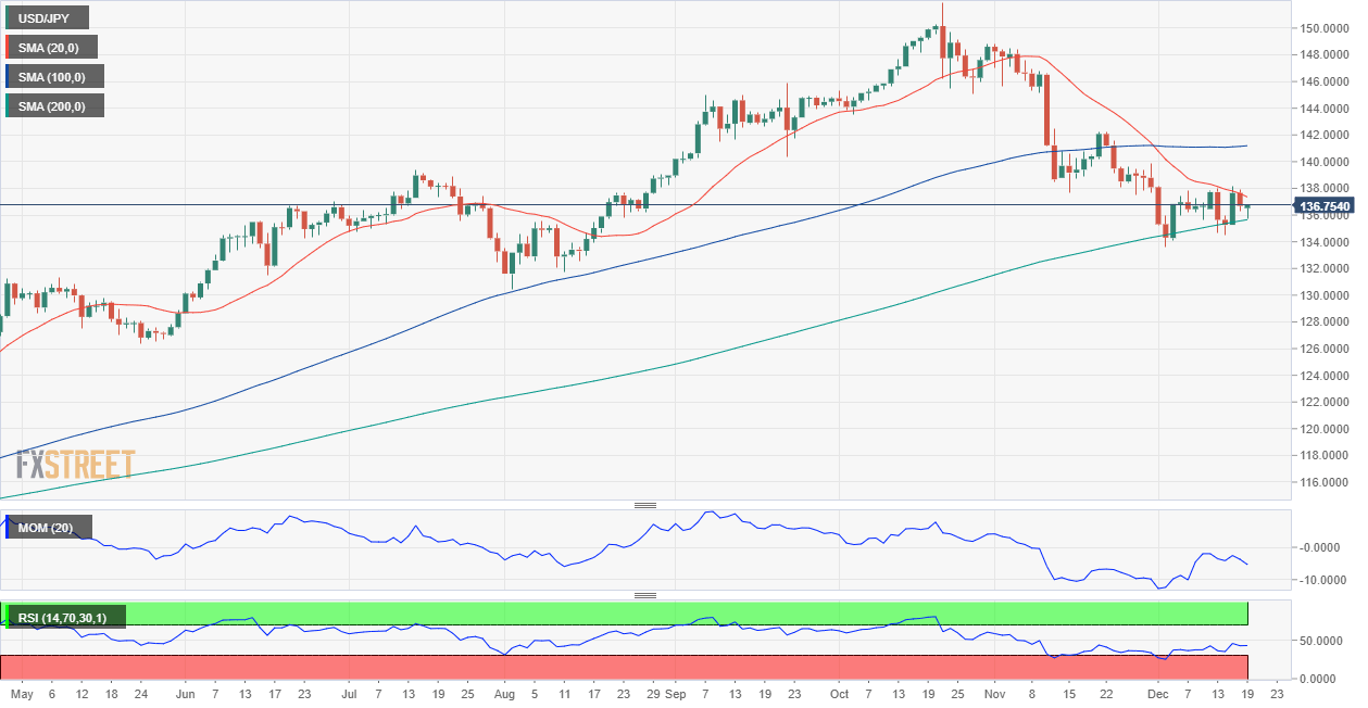 The USD/JPY pair trades at around 136.50 as the US Dollar advances alongside local government bond yields. The pair plummeted in November, bottoming at 133.60, and the subsequent recovery met sellers at around 138.00. The over 1,000 pips slide from the October high towards the aforementioned low resulted from mounting expectations inflation had begun receding in the US.