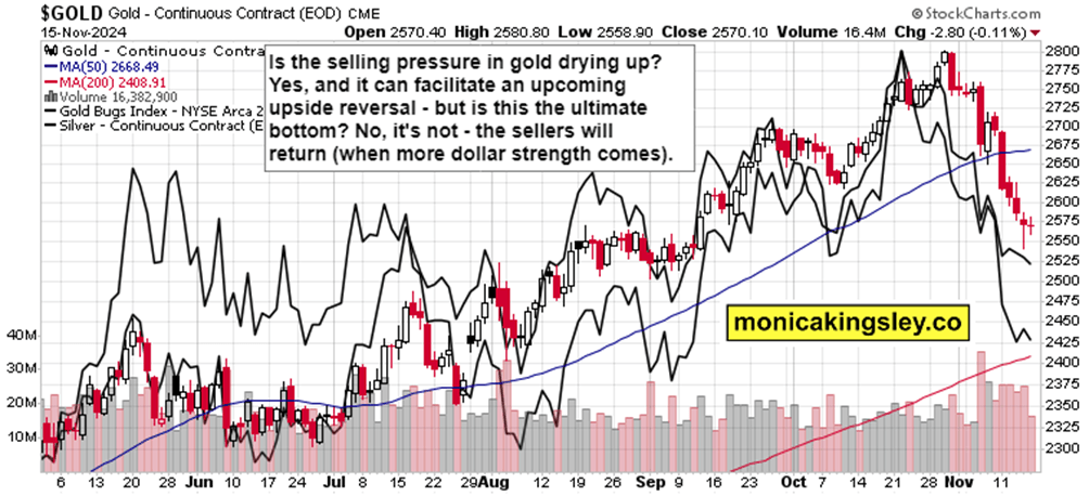 Precious metals are putting in a tentative bottom – an attempt that in itself is questionable. I continue favoring the sellers here whether we get a 1-2 days reprieve or not. $2,500 on this chart will be broken to the downside in the weeks ahead, but given that finally the bearish sentiment which I called for you at the very top to develop, is now quite widespread, it‘s thus favoring a retracement in the nearest days.