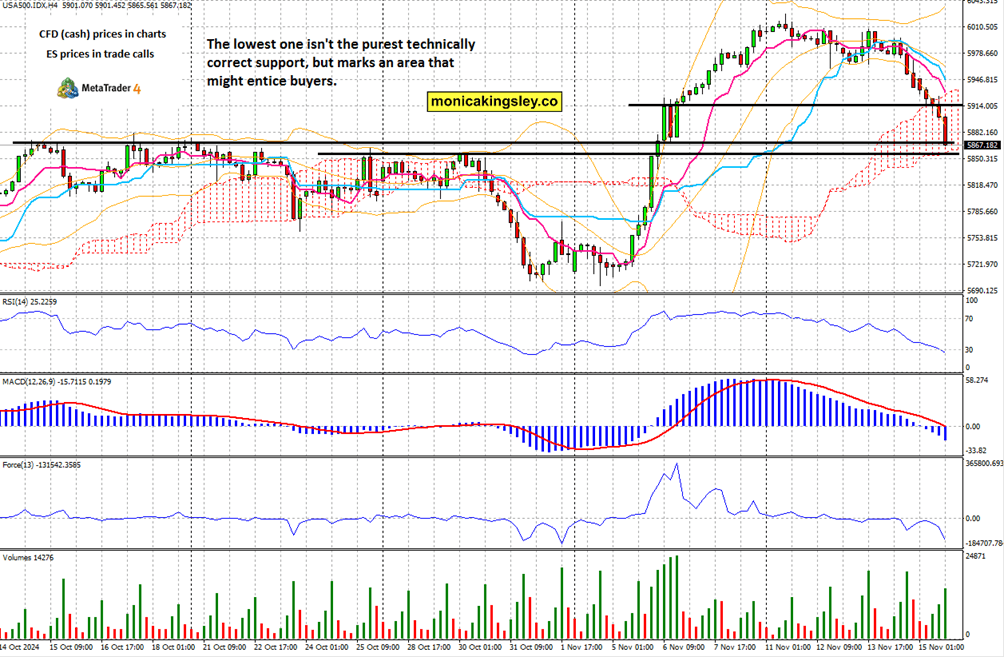 During the regular session, S&P 500 went for the fourth of support levels given in the Nov 12 article bringing you the hourly intraday chart – this level was more than amply pierced before some buying emerged before the close.