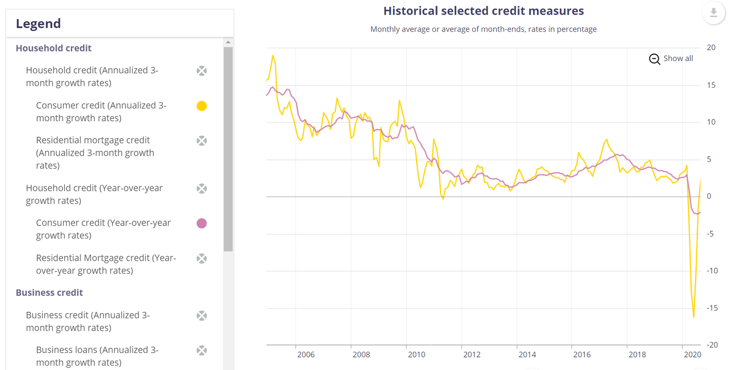 As the chart indicates by comparing year over year (purple) and quarterly (yellow) consumer credit growth rates, the Canadian consumer is seen as a much greater risk by lenders than in 2008’s recession. On this graph, the 2020 recession makes 2008 look as if it were a “normal” period! Most concerning is the fact that year over year consumer credit growth is negative, this will be a severe drag on the broad economy.