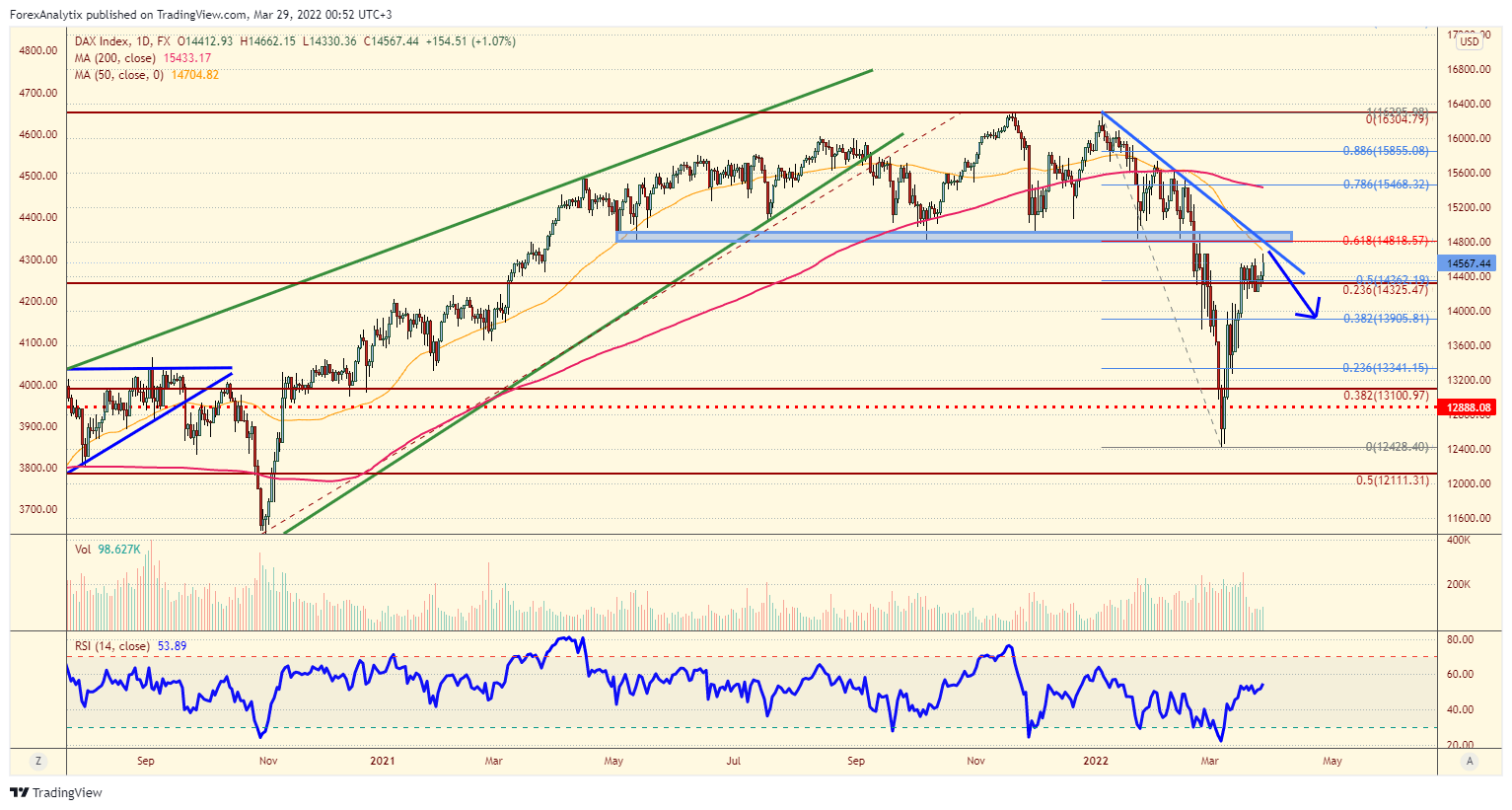 The DAX is nearing the big breakdown point which also coincides with the 61.8% Fibonacci retracement level of the 2022 highs to lows. Also, there were many spike lows in the "resistance zone" as well, from lows in mid 2021 through early 2022 before the breakdown. And the downtrend line also coincides with the 14820 level too, so if the market reaches for it, this could setup a a good risk/reward for shorts.