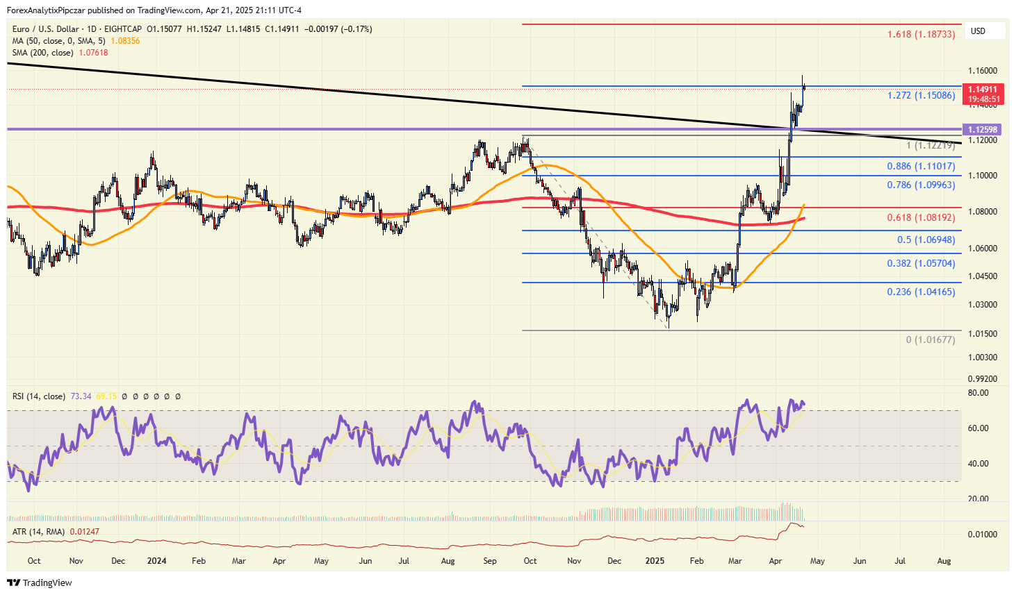 At this point the move doesn’t look too exhausted, but the RSI lack of upside is a risk for bulls. Should the EUR/USD make it to the 161% Fibonacci extension at 1.1873, that could be the last leg higher of the rally in the very near term.