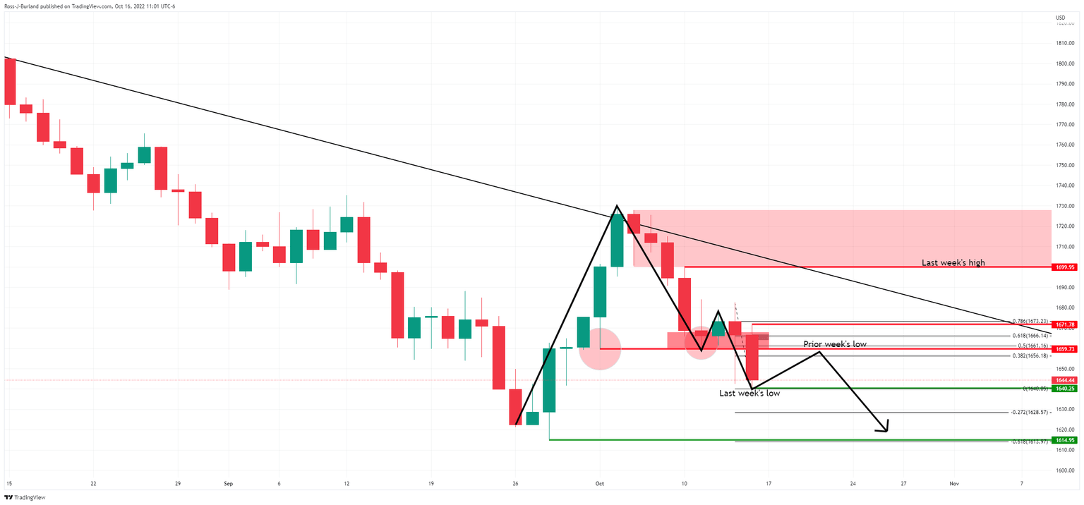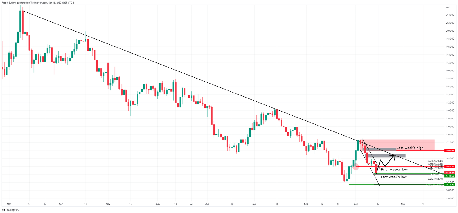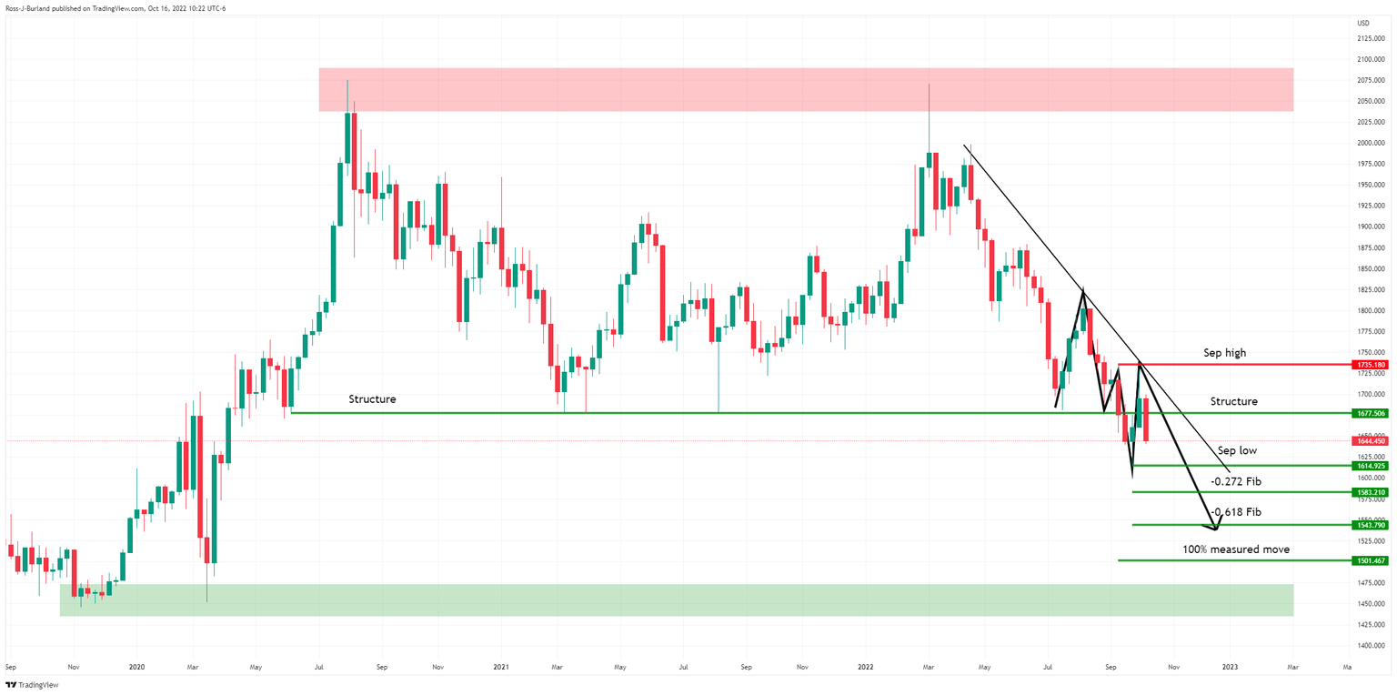 As illustrated, the price is back below the critical $,1670 structure on the weekly chart and remains on the front side of the bearish dynamic resistance. While below these, the outlook remains technically skewed to the downside. A break of September's low of $1615 opens the risk of a 100% measured move of the most recent bullish correction to the M-formation's neckline. This puts $1,500 on the radar and for a test to the 2020 demand area below it to $1,450.