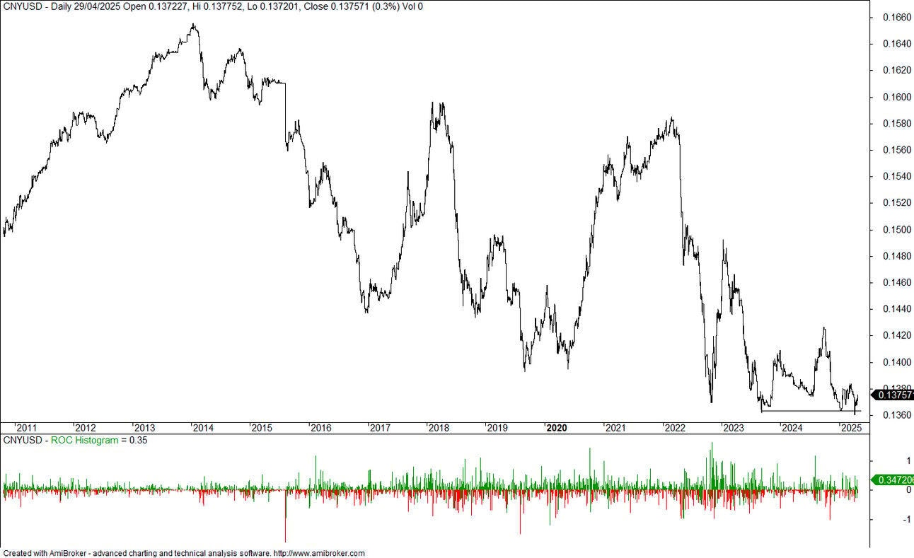 If you look at the Chinese 10-year bond yield, it is about to plunge to new lows. This indicates an economy that is cooling quicker than a London summer’s day. I see major fiscal stimulation coming to help the economy along. Not sure how interest rates stay so low, but if the rest of the world engineered zero interest rates, the Chinese can too. I guess we will continue to see a weak CNYUSD.