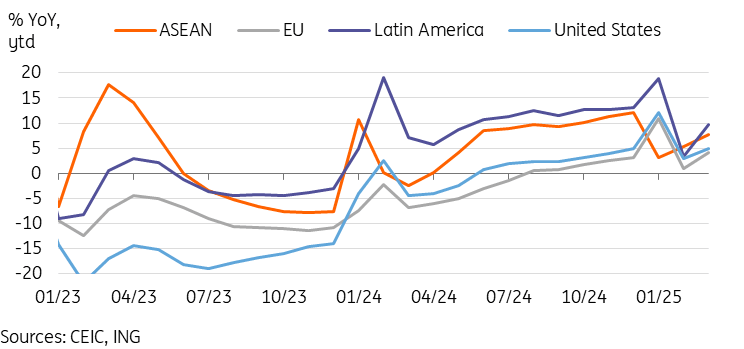 By export destination, exports to the US picked up despite President Trump’s fentanyl tariff hikes of 20%. The March data brings the first quarter growth rate to 4.5% YoY, up from 2.3% YoY in the first two months of the year. Savvy US importers likely saw tariff hikes coming in April onward and frontloaded imports. Furthermore, the tariff exemption for packages already in transit may have also supported the data. The US aside, exports to many other regions accelerated in March. Exports to ASEAN, China's largest export destination, accelerated to 8.1% YoY in first quarter, driven by strong export growth to Vietnam, Thailand, and Indonesia. Other outperformers included exports to India (13.8%) and Latin America (9.6%). On the other hand, exports to the EU (3.7%), Japan (2.8%), and Korea (-1.7%) underperformed the headline growth.