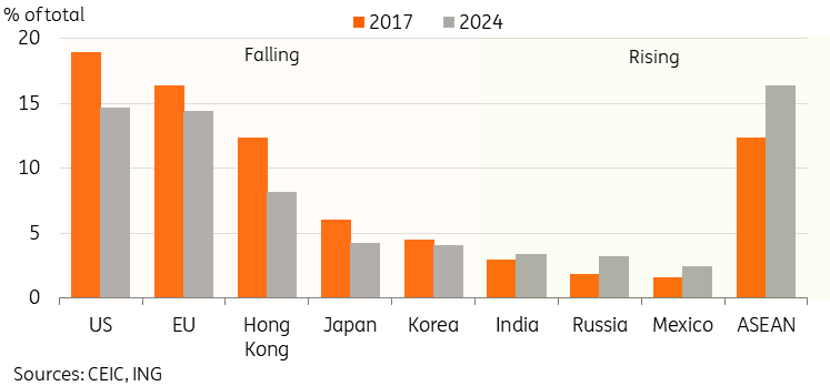 As we’ve written in the past week, it's likely that China and the US are now in a test of endurance. Nonetheless, we expect that talks eventually will resume in the coming weeks and months. Much has been made of US de-risking of China in the past few years. But China's de-risking from the US, with a lower proportion of US-bound exports and fewer companies existentially reliant on US suppliers or customers, also has emboldened policymakers to retaliate.