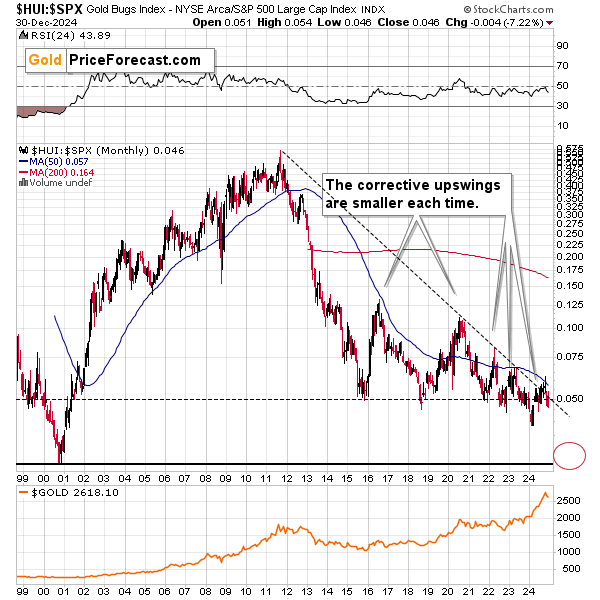 If you look at the lower part of the above chart, you’ll see that the XAU Index – proxy for gold and silver stocks – just invalidated its own move to new highs and above the declining dashed resistance line. When we saw that in 2022, a big decline followed. Given the importance of the invalidation in world stocks, it seems that the following decline in the XAU Index (and other proxies for mining stocks like GDX and GDXJ) will be bigger than what we saw in 2022.