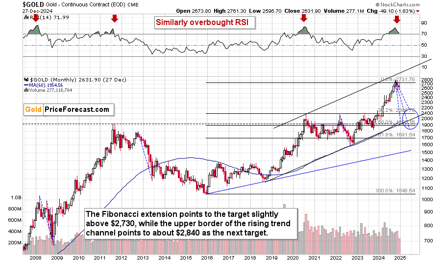 RSI based on monthly candlesticks was just so extremely overbought as it was at the previous very important tops. This is a highly effective indication, so it’s no wonder that gold is already declining. The point here is that based on how lower gold used to decline after such sell signals, it has much more room to fall.