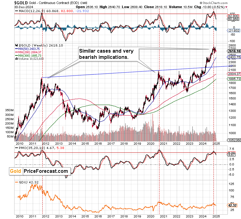 RSI is not the only indicator pointing to much lower gold prices in the following months. The same goes for the MACD and PMO based on gold’s weekly price changes.