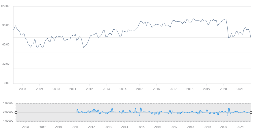 “The August collapse of confidence does not imply an imminent downturn in the economy. There was a similar episode which occurred in September 2005, with comparable declines in the Sentiment Index (13.7% in 2005 vs. 13.4% in 2021). The cause of the steep falloff in 2005 was the devastation from hurricane Katrina and rising energy prices. The impact of 9/11 was another non-economic event that had an immediate impact on consumers' expectations and emotions," wrote Survey of Consumers chief economist Richard Curtain in the accompanying note.