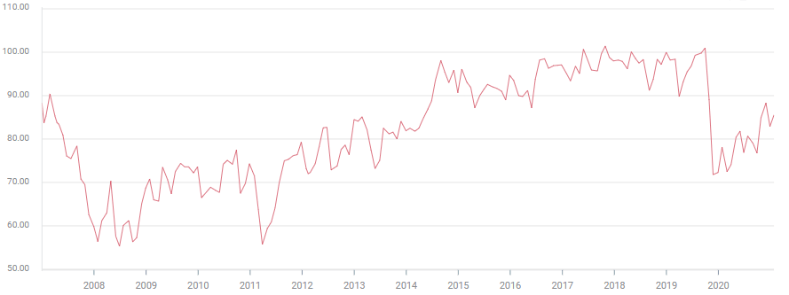 The Consumer Sentiment Index from the University of Michigan has moved in a narrow 5.4 range since March with April the high at 88.3 followed by the low of 82.9 in May. The June score of 85.5 is almost half-way between the February 2020 reading of 101 and the April low of 71.8.