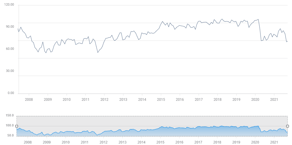 Michigan Consumer Sentiment was issued on September 17. The consensus forecast was for a slight rise to 72.2 from August’s revised 70.3 score. Sentiment came in at 71, like the August figures, the lowest since the nadir of last year’s pandemic panic in April at 71.8.