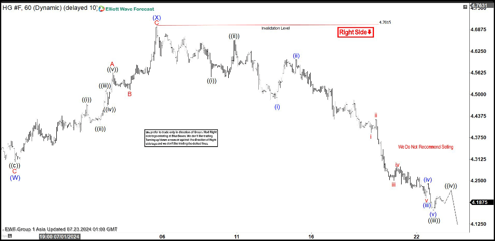 Short term Elliott Wave view in Copper (HG) suggests that correction from 5.20.2024 high remains in progress. The internal subdivision of the correction is unfolding as a double three Elliott Wave structure. Down from 5.20.2024 high, wave (W) ended at 4.305 and rally in wave (X) ended at 4.7015. Wave (Y) lower is in progress as a zigzag structure. Down from wave (X), wave ((i)) ended at 4.551 and rally in wave ((ii)) ended at 4.657. The metal then extends lower again in wave ((iii)).