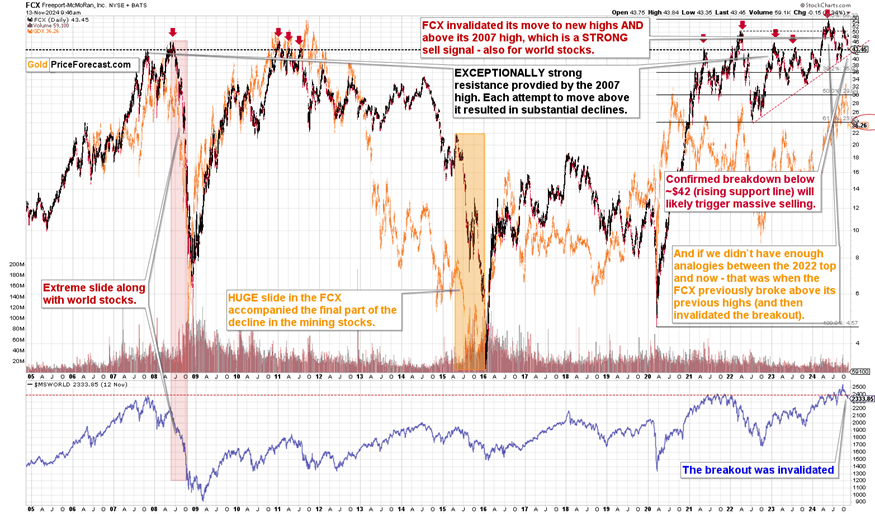One is that we already saw an invalidation of the breakout to new all-time highs earlier this year. Right now, FCX is at its 2007 highs (yup, 17 years have passed and FCX is at the same nominal price levels), and it looks like it’s about to invalidate the move above those highs once again. Just like it did in each previous case.