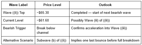 Investors should watch closely for a decisive break below the descending channel. If it occurs, it would strongly support the view that we are in the middle of Wave (iii) of ((iii)), which typically brings aggressive selling and high momentum.