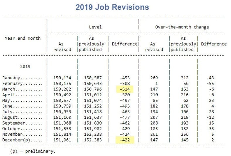 For December 2019, the BLS previously reported jobs at 152,383,000. Today we see it's really 151,961,000.