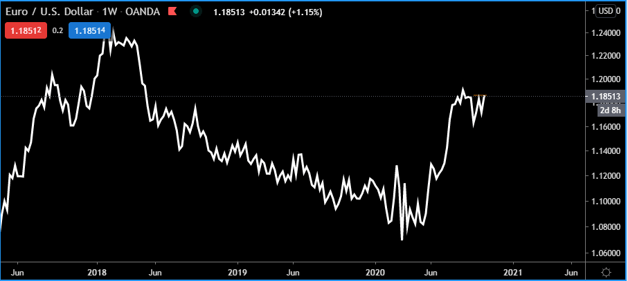 Let’s take a look at the DXY (U.S. Dollar Index) which is the measure of the dollar against a basket of 6 major currencies (with the Euro making up about 58% of the basket). The chart below shows where DXY currently sits, about 93.00 upon time of writing. Since the dollar’s spike back in March, it has sold off roughly 10%. The dollar bears have been out in full force calling this the beginning of the end for the Global Reserve Currency as we know it. But, let’s take a closer look. As we know, the DXY is heavily weighted in the euro. That makes the inverse relationship between the euro and the USD quite strong. This correlation rarely breaks down. Put another way, euro strength = dollar weakness and vice versa. As you can see (below) the euro has been very strong against the dollar, up over 11% since the March lows.