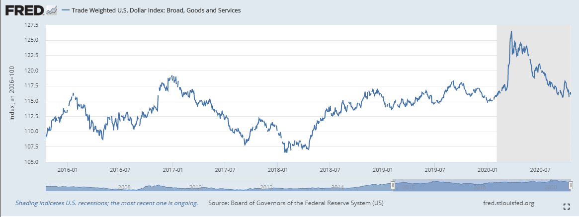 However, if we are to take a look at the Trade Weighted U.S. Dollar Index (below), which calculates the purchasing power of the U.S. dollar against 26 trading partners, as opposed to the DXY which only measures the dollar against 6 major currencies (with a majority weighting in the euro) you can see that it has held up much better since its highs in March. The DXY has broken well below where it spiked up from in March, whereas the trade weighted dollar has not. Given the difference in calculations between these two dollar indexes, the trade weighted dollar appears to be the more reliable of the two. Hardly the selloff many are making it out to be.