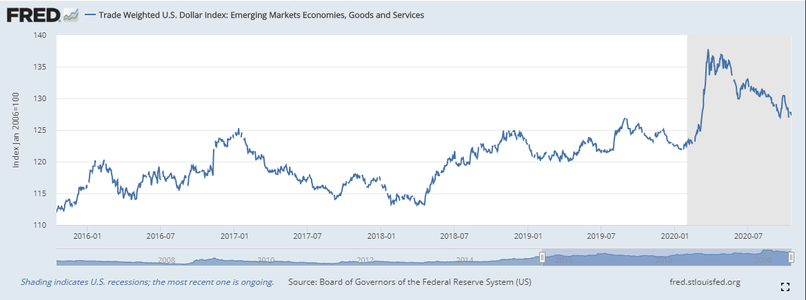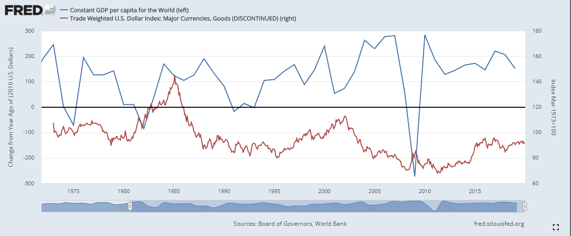 What does the dollar mean for the global economy? Typically, the global economy has seen stronger periods of growth when the dollar depreciates and slower periods of growth when the dollar appreciates (as seen below). As the largest consumption nation, the U.S. benefits from a strong dollar because it makes imports much cheaper. But, for the rest of the world, especially EM (emerging markets) economies, a strong dollar causes problems. A strong dollar makes servicing dollar-denominated debt much more difficult. EM economies tend to borrow in dollars more than developed nations do, however, their assets are usually denominated in their local currency. This creates issues when EM nations need to service their dollar-denominated debts as their weaker currency must be converted into dollars to do so. In a crunch, developed nations that own U.S. assets can sell them to obtain the dollars they need, whereas the EM nations do not have such flexibility.