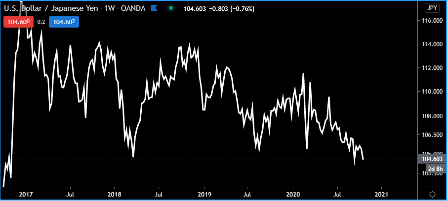 Now, let’s take a look at the trade weighted U.S. dollar against EM economies. As you can see (below), the dollar has held up much better against emerging markets, post-pandemic, than it has against developed nations. And both trade weighted dollar indexes have held up much better than the DXY, or should I say euro. We can even look (below) at the Japanese Yen which holds the second largest weighting of the DXY, with close to 14%. Since March, the dollar has fallen roughly 6% against the yen. Between the euro and the yen, that makes up approximately 72% of the DXY, yet people are seeing the fall in the DXY as the dollar’s death and not what it really is, euro and yen strength.