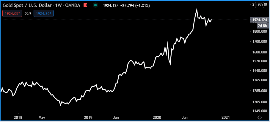 If we look at gold (below), we can see that it broke out of its consolidation back in June 2019 and has been on an upward trajectory ever since. Gold has historically been a safe haven and a store of wealth. Recently (post 2008 recession), it has also been a hedge against failed monetary policy. Gold, similar to the dollar and the yen, generally rises during times of economic stress. Since the selloff in March, gold has been one of the best performing assets, right alongside equities.